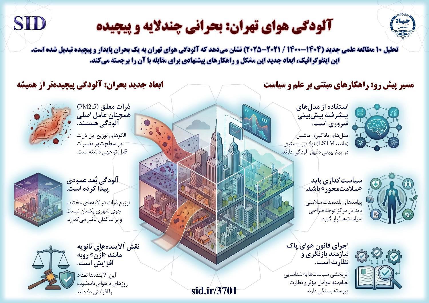 به گزارش روابط عمومی مرکز اطلاعات علمی جهاددانشگاهی (SID)، نتایج ۱۰ مطالعه علمی و سیاستی منتشرشده در فاصله سالهای 1400 تا 1404 (۲۰۲۱ تا ۲۰۲۵ میلادی) که دادههای کیفیت هوای تهران را در بازه 1381 تا 1400 (۲۰۰۳ تا ۲۰۲۲ میلادی) تحلیل کردهاند، نشان میدهد که روند آلودگی هوای تهران نهتنها کاهش قابلتوجهی نداشته، بلکه ابعاد تازهای همچون توزیع عمودی ذرات، تغییرات بلندمدت غلظت آلایندهها، نقش ازن و چالشهای سیاستگذاری را نیز برجستهتر کرده است. این بررسی که تصویری جامع و چندبعدی از وضعیت آلودگی هوای تهران ارائه میدهد، نشان میدهد که آلودگی هوا در تهران ماهیتی پایدار، ساختاری و در برخی حوزهها پیچیدهتر از گذشته دارد.