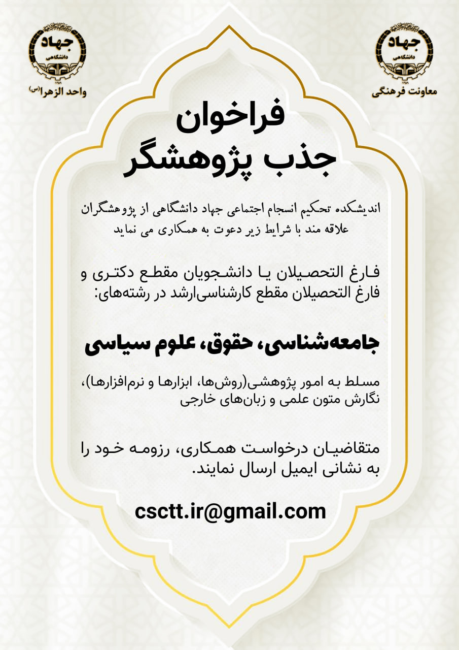 فراخوان جذب پژوهشگر در اندیشکده تحکیم انسجام اجتماعی